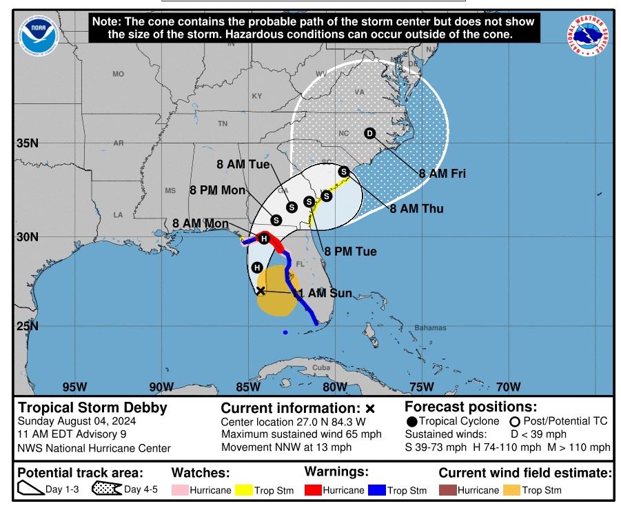 The City of Fort Pierce continues to monitor potential weather impacts for our area. Currently, Tropical Storm Debby has formed in the southeastern Gulf of Mexico where it is forecast to strengthen to a Category 1 Hurricane before making landfall along Florida’s Big Bend Monday morning.